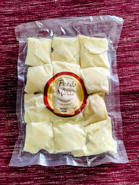 Nosso produto é artesanal, feito 100% à mão e vem congelado. A massa já está pronta para o consumo, não necessitando de pré-cozimento e nem descongelamento para o preparo.